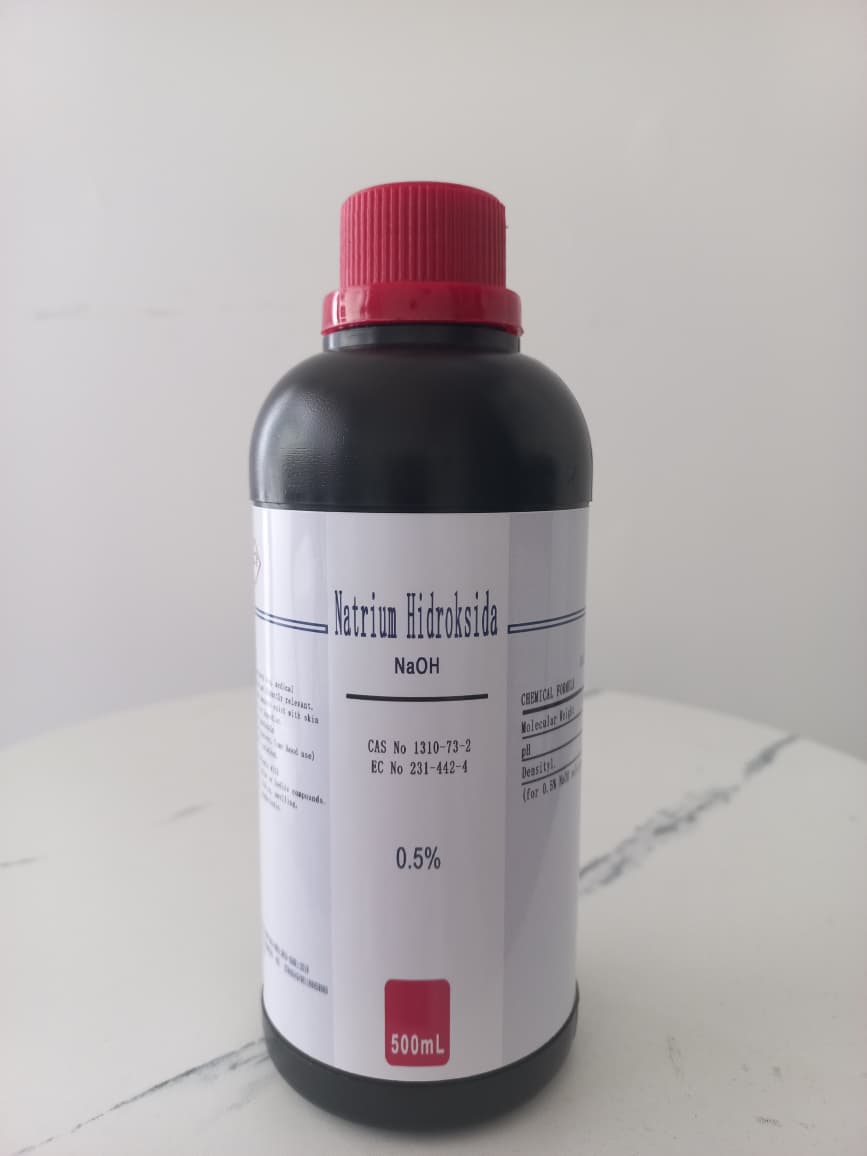 Natrium Hidroksida, yang lebih dikenal dengan nama Sodium Hidroksida (NaOH), adalah senyawa anorganik yang sangat korosif. Senyawa ini banyak digunakan dalam berbagai aplikasi industri dan laboratorium karena kemampuannya yang kuat untuk menetralkan asam dan reaktivitasnya yang tinggi dalam larutan akuatik. Sodium Hidroksida sering disebut juga sebagai caustic soda atau lye, dan pada bentuk padatnya, senyawa ini berwarna putih. Namun, dalam banyak aplikasi, NaOH lebih sering dijumpai dalam bentuk larutan air dengan berbagai konsentrasi. Pada produk ini, konsentrasinya adalah 0,5%, yang membuatnya cocok untuk berbagai keperluan laboratorium seperti titrasi dan penyesuaian pH dalam eksperimen.